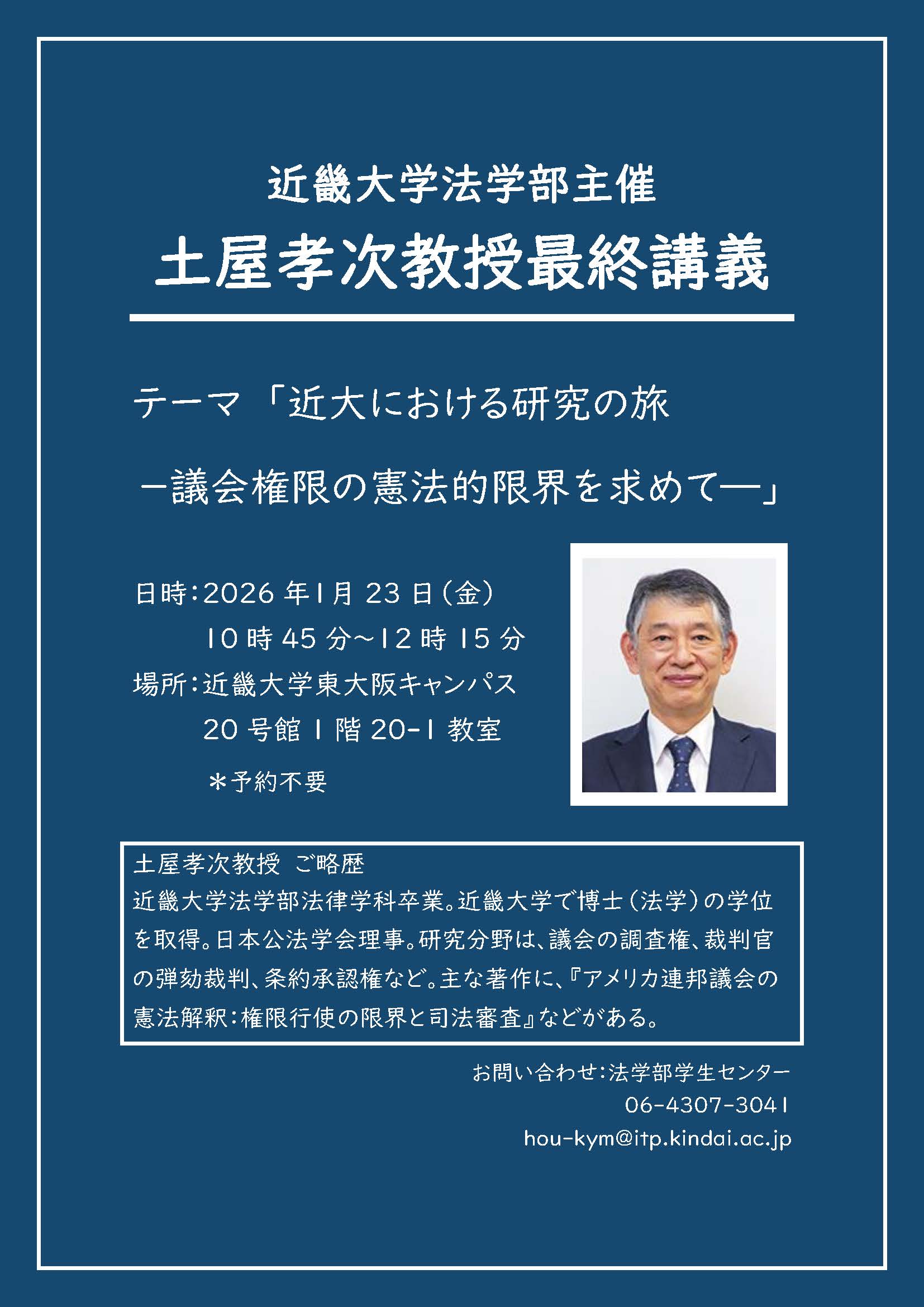 法友会役員(顧問)である法学部法律学科 土屋 孝次(つちや たかつぐ)教授の最終講義が下記の期日に開催されますのでご案内申し上げます。